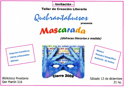 A continuación de la audición está prevista la apertura de la muestra denominada “Mascarada” (disfraces literarios a medida) que este año promete diferentes alternativas tales como: espacios temáticos para indagar, ampliación de la muestra itinerante de afiches y los creativos libros confeccionados por cada autor.